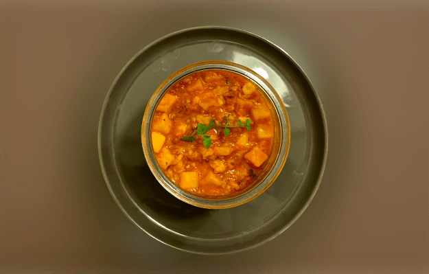 Tirare la linguetta della guarnizione e servire subito Zuppetta di Patate e Gamberi in Vasocottura al Microonde
