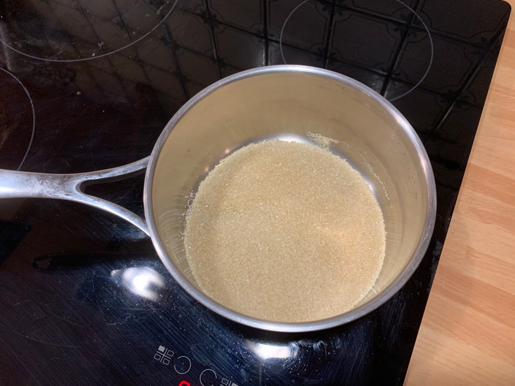 Per il caramello alle arachidi unire l’acqua e lo zucchero in un pentolino finché non assume un bel colore ambrato