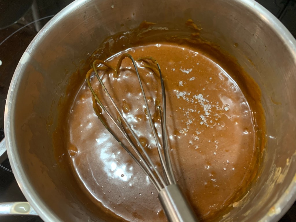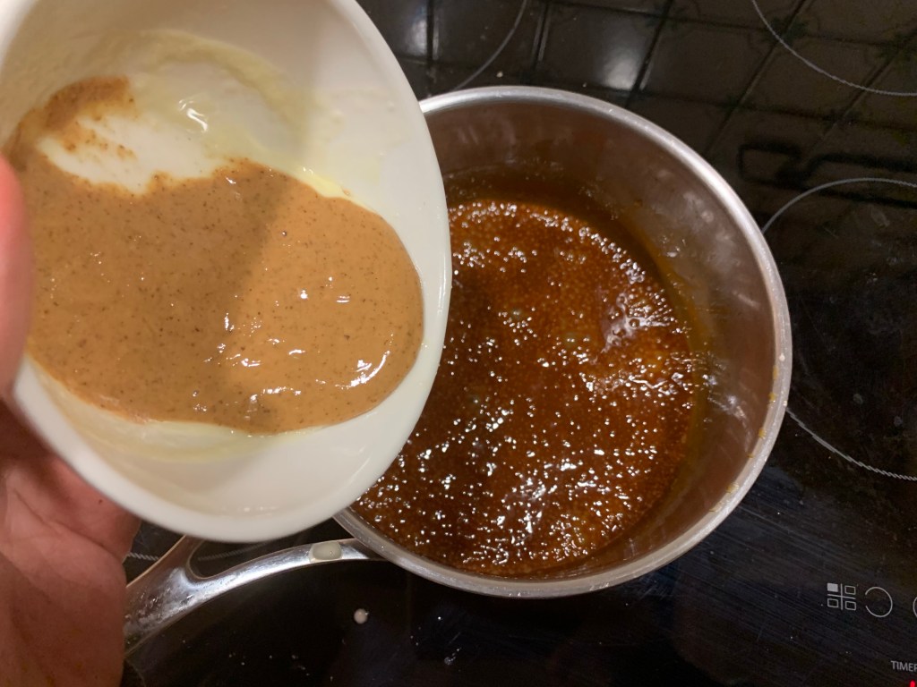 Fuori dal fuoco, aggiungere lentamente la panna al caramello, facendo attenzione a non bruciare si. Rimettere sul fuoco fino a quando la temperatura non raggiunge i 122 gradi
