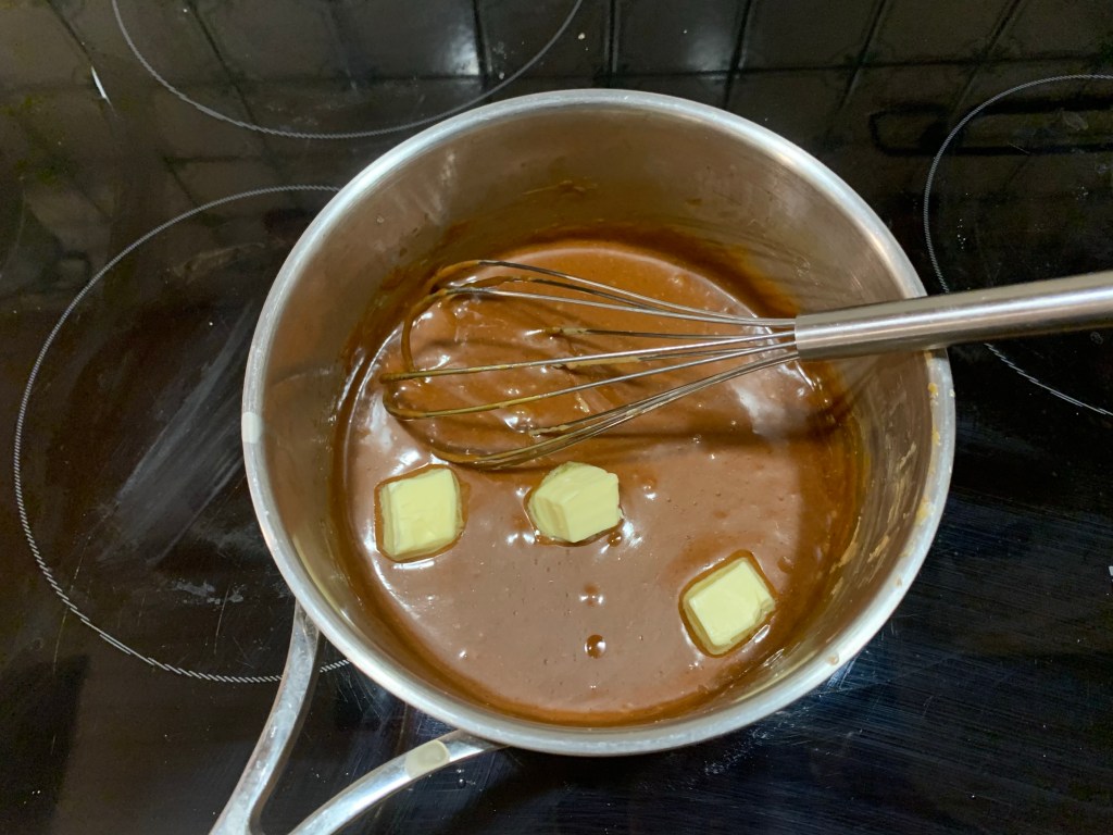 Spegnere quindi aggiungere il liquore, il burro di arachidi e il fior di sale poi mescolare fino ad ottenere una pasta liscia. Lasciar raffreddare per qualche minuto quindi aggiungere il burro a pezzetti, ed emulsionare con un minipimer