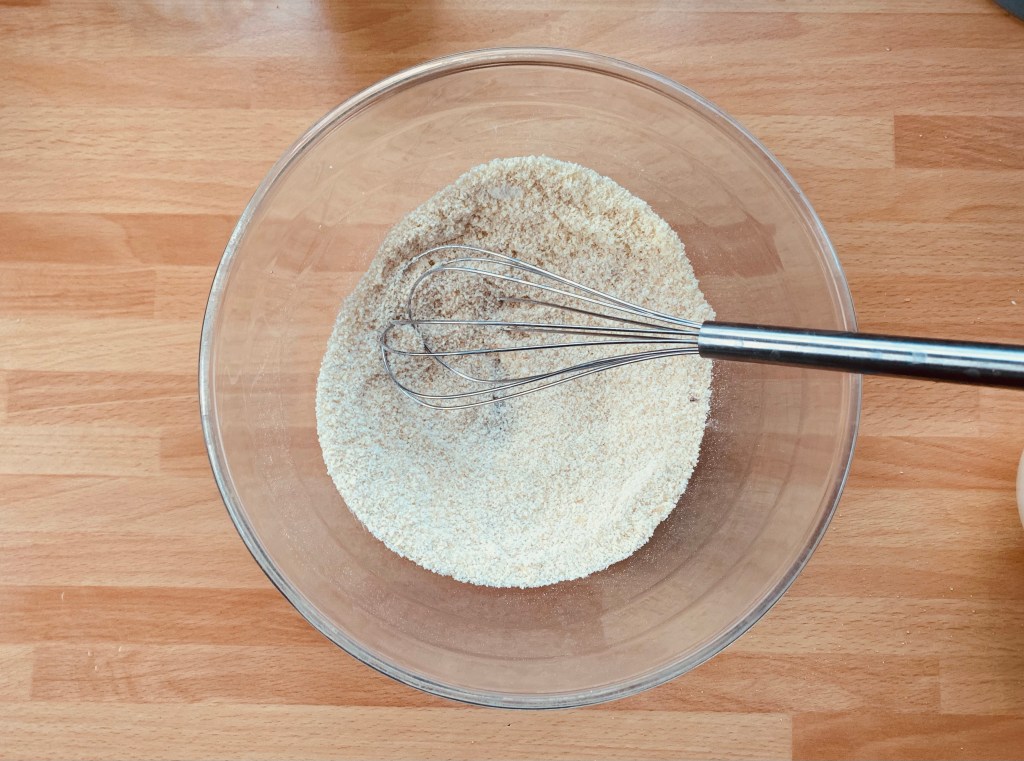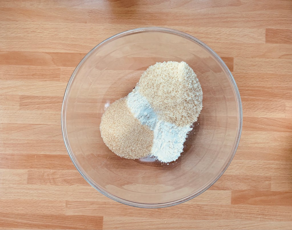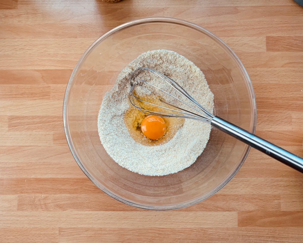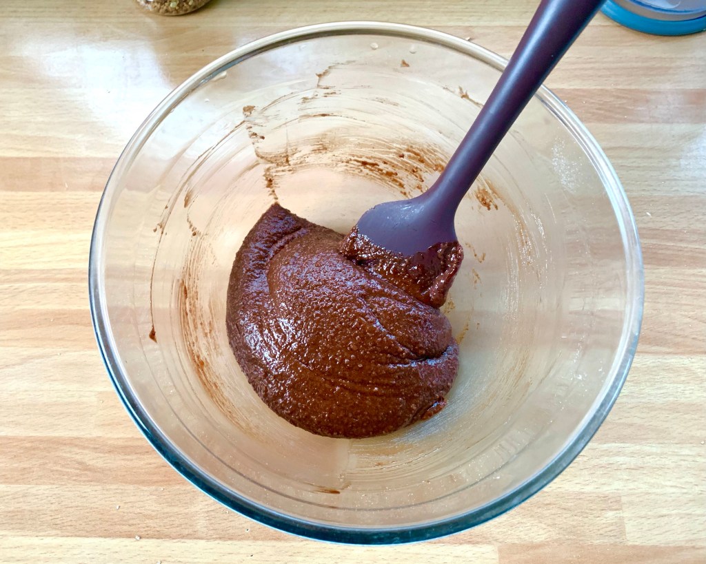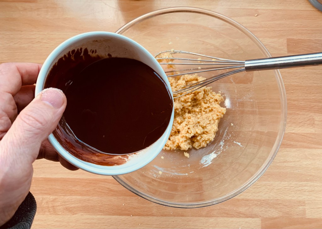 Unire in una ciotola lo zucchero a velo, la farina e la farina di mandorle, mescolare le polveri con una frusta a mano, aggiungere l’uovo e mescolare energicamente, unire il cioccolato sciolto con il burro e mescolare il composto fino ad ottenere un composto uniforme