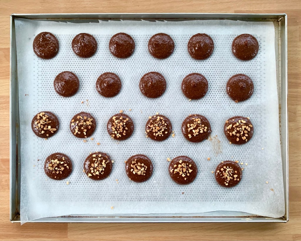 Mettere il composto in una sacca da pasticcere e formare dei piccoli mucchietti di circa 3/4 cm di diametro su una teglia ricoperta con carta da forno o tappetino di silicone, come dei macarons, poi sbattere 3/4 volte la teglia sul tavolo per far abbassare le punte