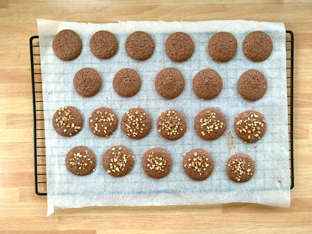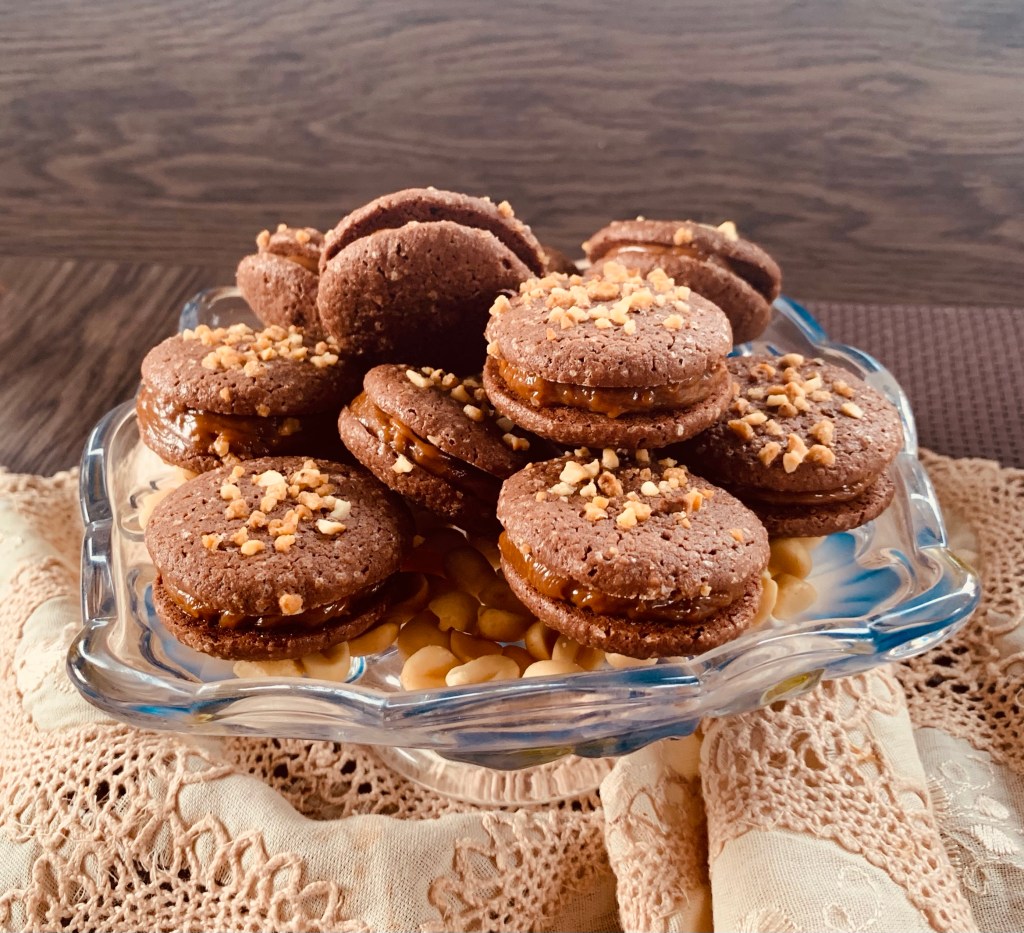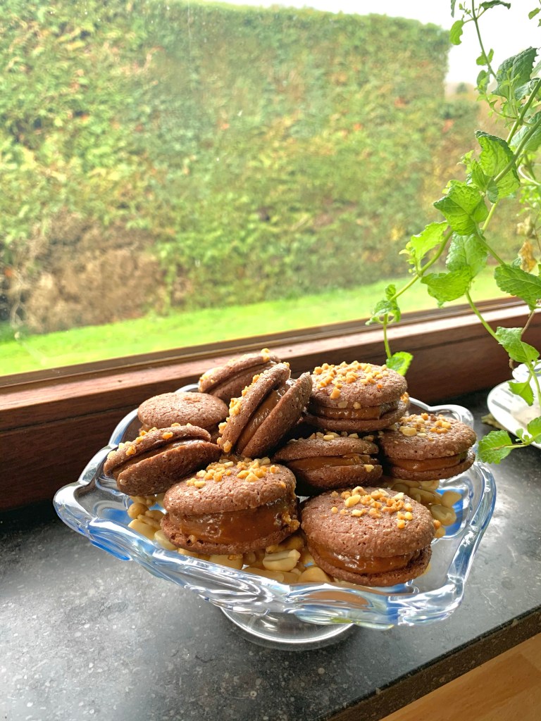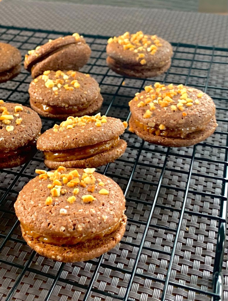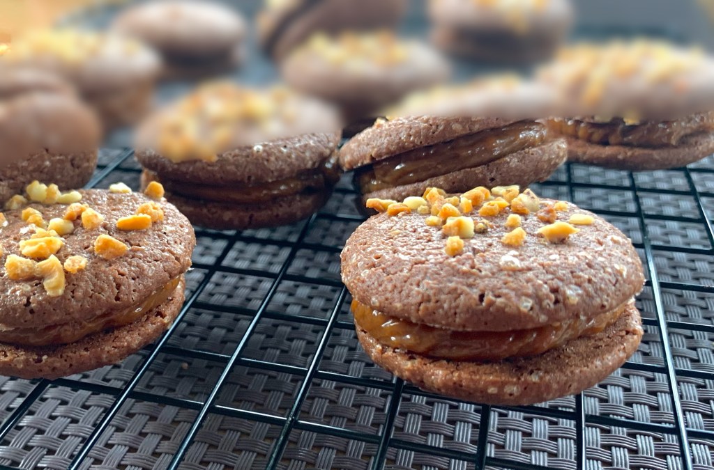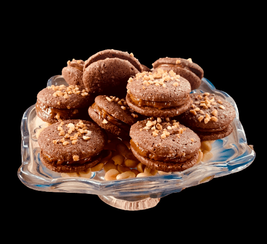 Quindi, più in dettaglio, i koonies sono deliziosi biscotti a metà tra dei cookies e brownie, (Koonies) a forma di macaron ma con morbidi gusci di cioccolato cosparsi di scaglie di arachidi e guarniti con un caramello di arachidi. Se consumati Il giorno dopo o anche due giorni dopo, sono più buoni una vera delizia. Il biscotto è molto morbido e l’associazione con il caramello di arachidi porta una grande dose di prelibatezze, che dà loro un lato molto avvincente! E sì, spesso è così in pasticceria, gli aromi e le consistenze si rivelano nel tempo!