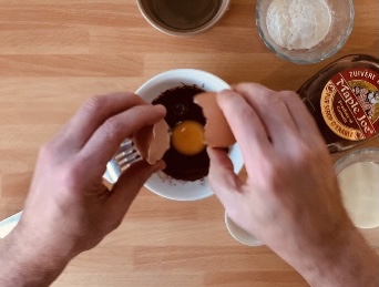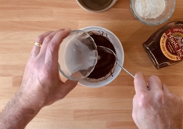 Unire in una ciotolina il cioccolato fuso, l’olio di cocco, il cacao e mescolare con una forchetta