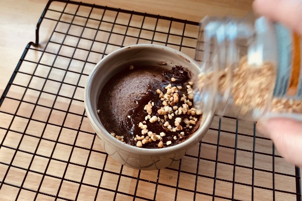 Coprire per metà il Tortino con la granella di nocciole e degustarlo tiepido… colante di cioccolato fondente