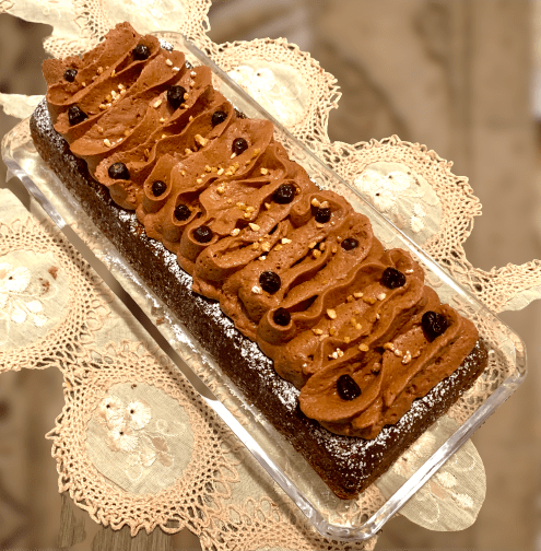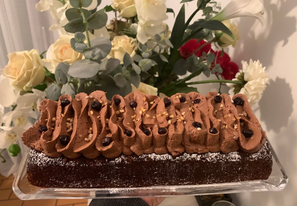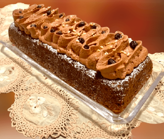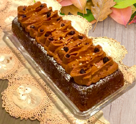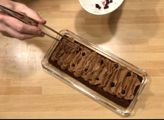Decorare la superficie del Plumcake con la Mousse di Cioccolato all’Aquafaba, qualche mirtillo e della granella di noci