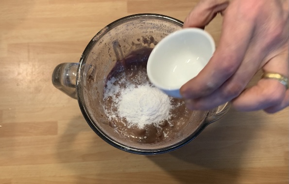 Aggiungere la farina d’avena, l’amido di mais e il cacao setacciati insieme e frullare fino a incorporarli nell’impasto, pulire i lati del frullatore con una spatola per assicurarsi che tutto sia amalgamato allo stesso modo.