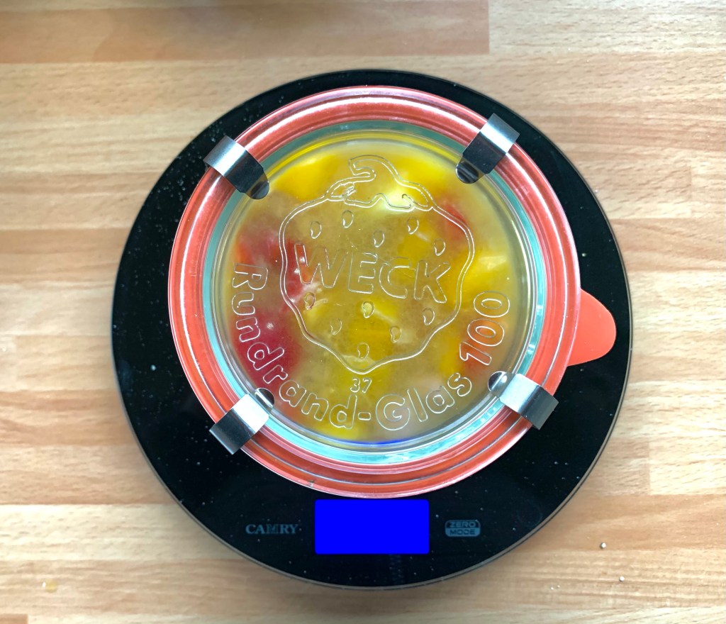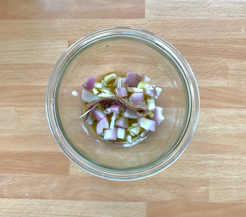 Unire nel vasetto Weck da 500 ml lo scalogno tagliato a dadini, l’olio e l’acciuga poi soffriggere al microonde senza tappo per 1 minuto e mezzo a 750 watt