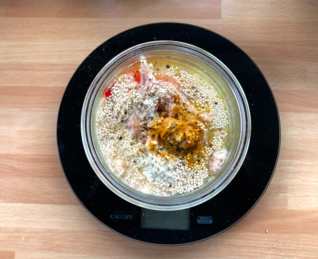 Aggiungere i peperoni, il tonno, la quinoa, il sale, il pepe, la curcuma, l’acqua e il brodo vegetale, mescolare tutti gli ingredienti con un cucchiaio