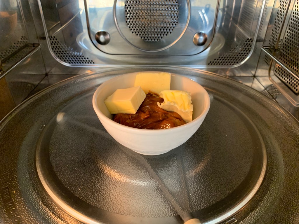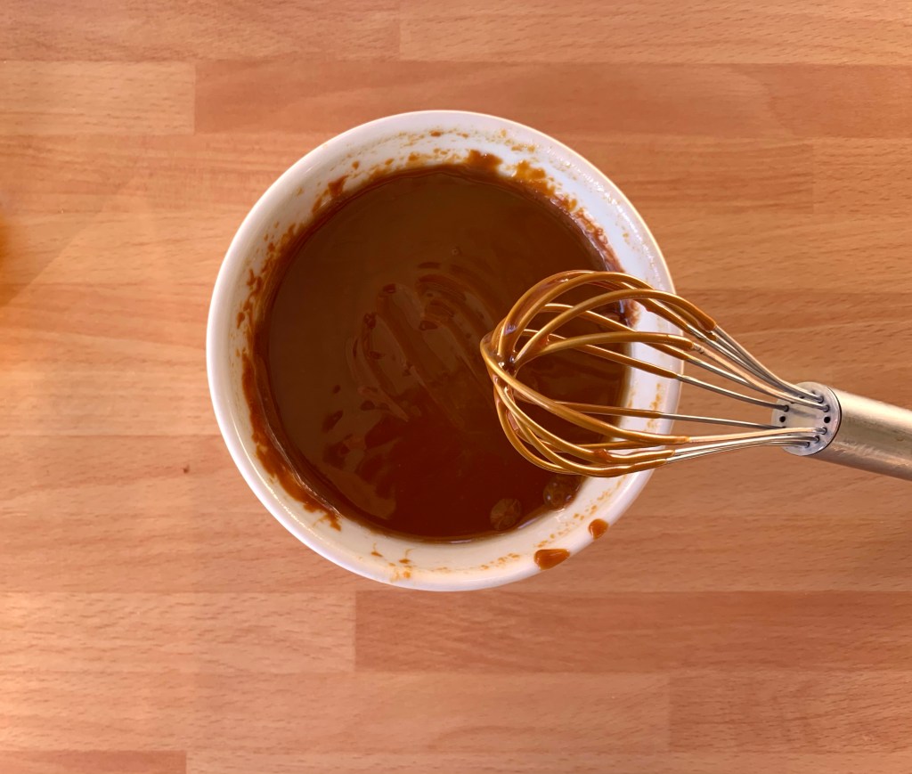 In una ciotola, unire il Dulche de Leche e il burro e sciogliere al microonde 1 minuto, mescolare con una frusta a mano