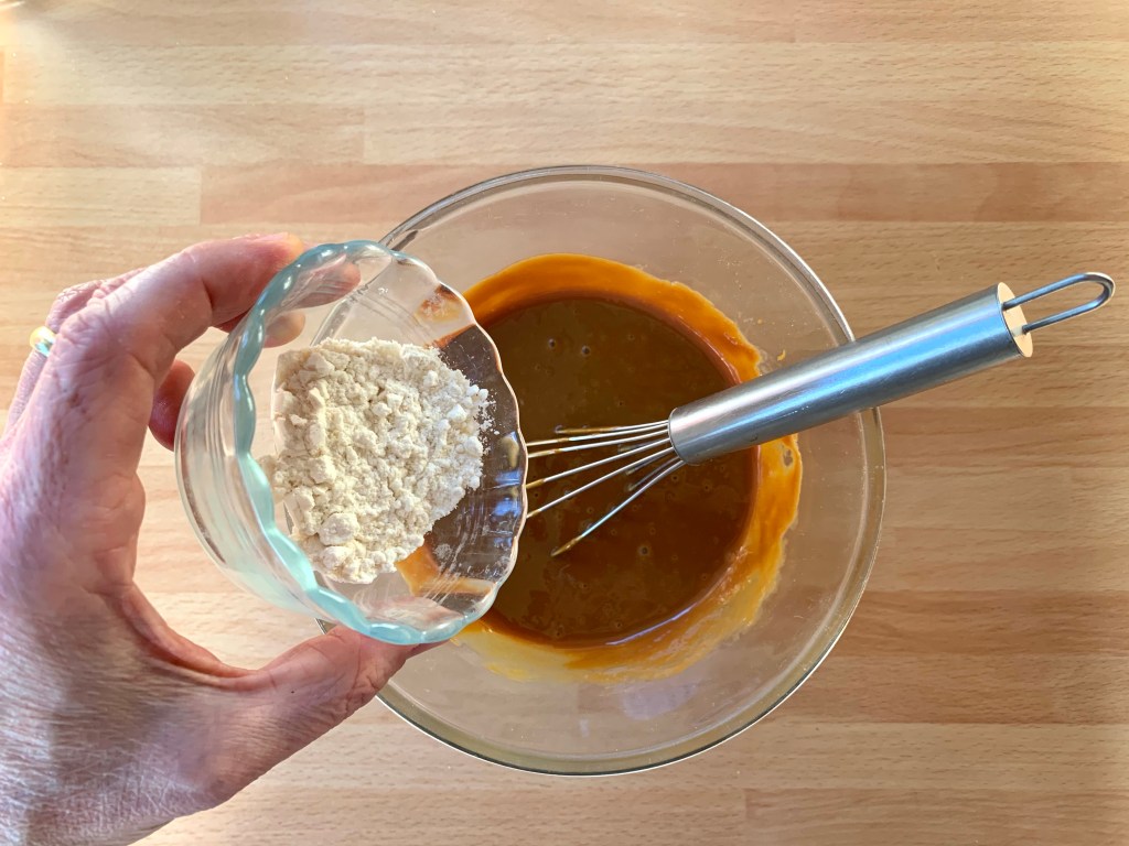 Aggiungere la farina, un po’ alla volta, per garantire che tutto sia amalgamato in modo uniforme e che la pastella sia liscia