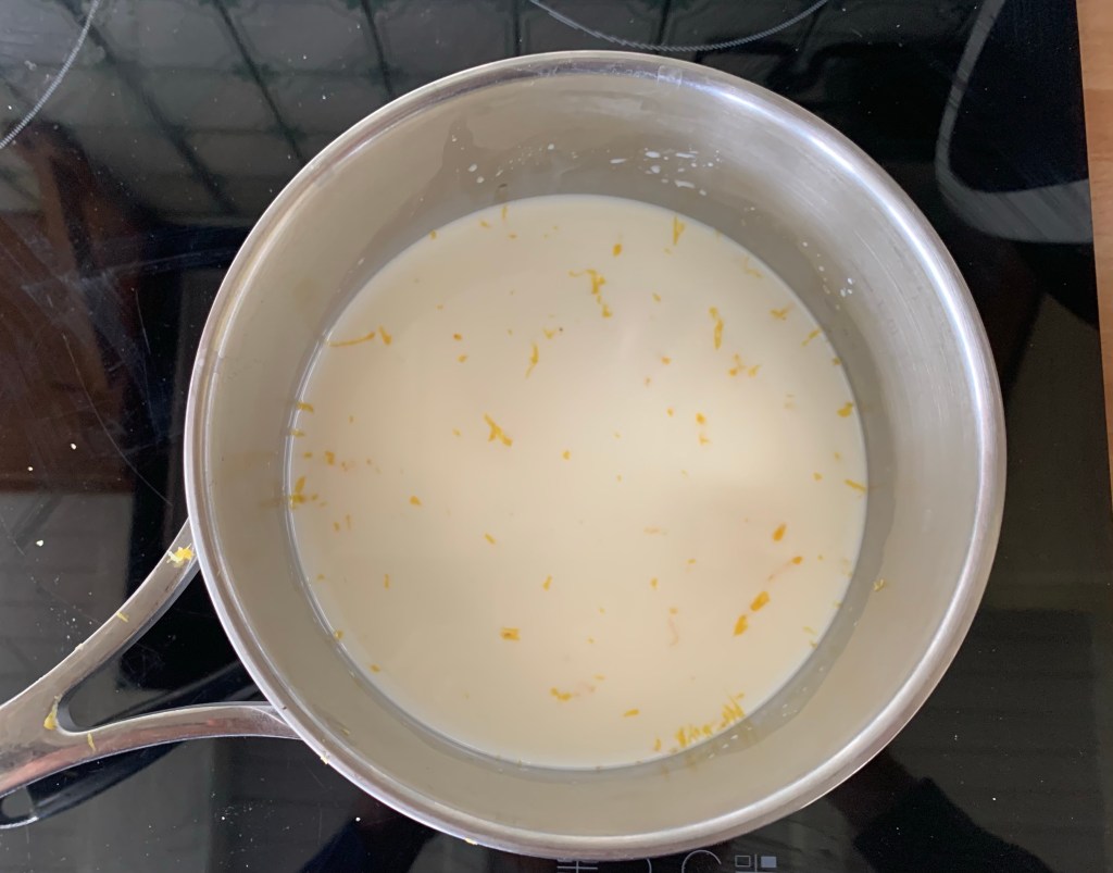 Versare il Latte in un pentolino con le zest di limone e il glucosio, dopo averlo portato a primo bollore versarlo nella bulle degli amidi, lo zucchero e le uova intere mescolati insieme. Rimettere il composto nel pentolino e cuocere la Crema sul fuoco fino a 85 gradi mescolando sempre con una frusta.
