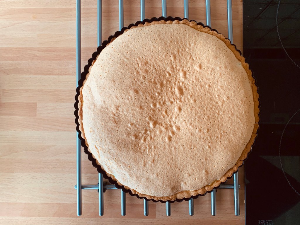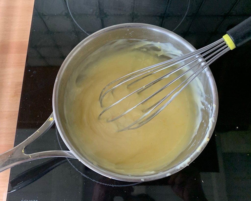 A fine cottura aggiungere il limoncello e versarla in una bulle, frullarla con un mixer ad immersione e coprire per metà il guscio di frolla cotta e mettere da parte