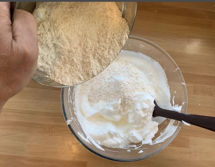 In una ciotola unire lo zucchero a velo, la polvere di pinoli, la farina, la polvere di mandorle e mescolare le polveri con una frusta poi aggiungere il mix a mano delicatamente alla meringa in due volte.