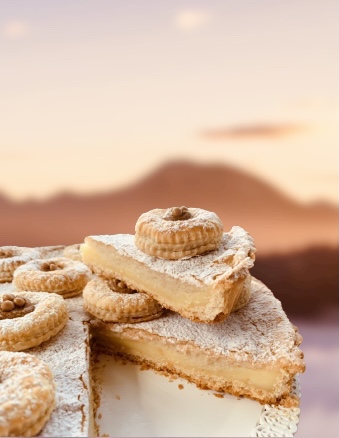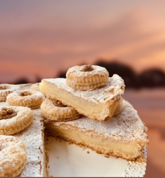 Una torta tradizionale, la torta della nonna, rivisitata da Maurizio Santin che l’ha trasformata in una Crostata golosa ed elegante. Ci sono tutti gli ingredienti della tradizione, ma utilizzati in maniera differente, come i pinoli meno invasivi con il loro gusto inseriti in polvere nella dacquoise.