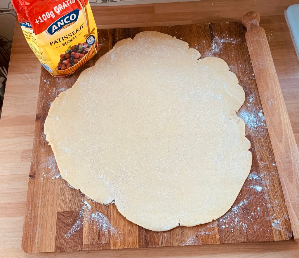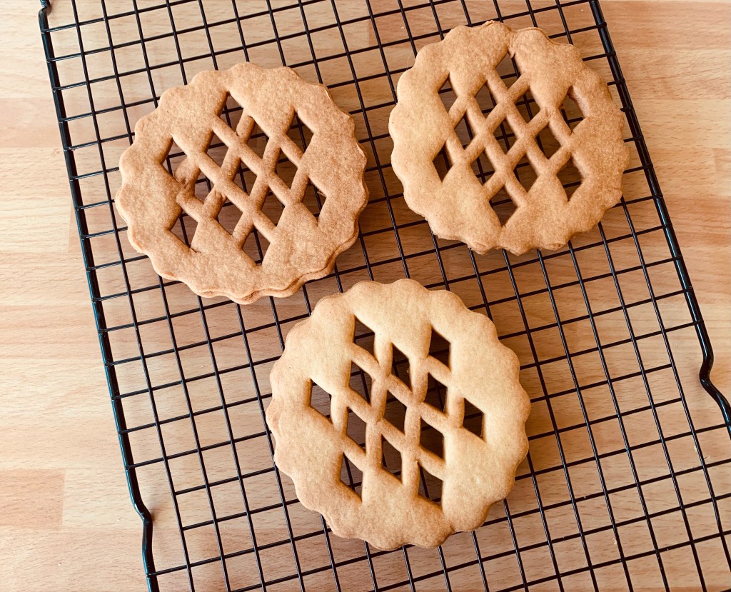 Preparare la frolla secondo la ricetta posta in ingredienti, dopo averla fatta riposare stenderla a 2 millimetri di altezza e coppare dei dischi del diametro della ciotolina e bicchiere che verranno usati per contenere il Soffiato di Pastiera, la metà dei dischetti verranno forati con l’apposito attrezzo a griglia