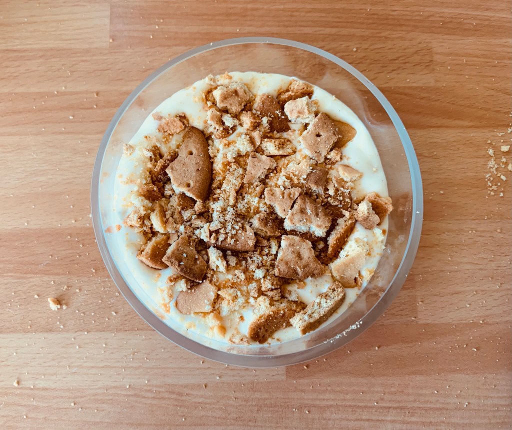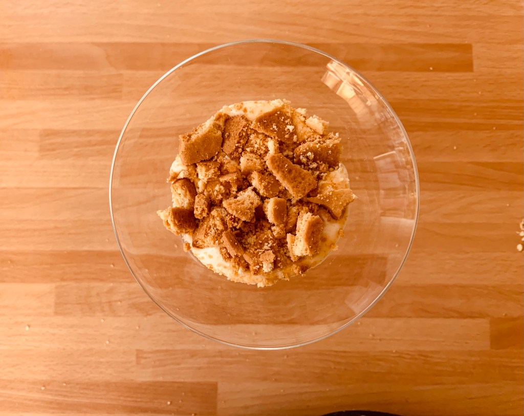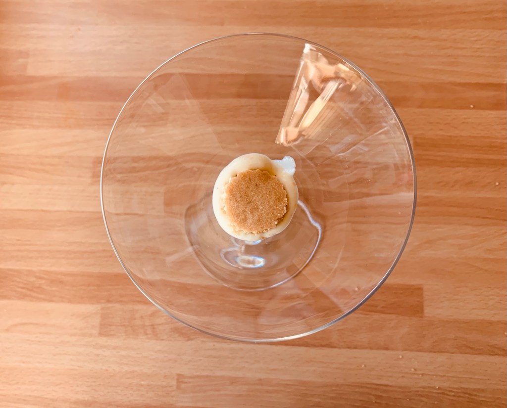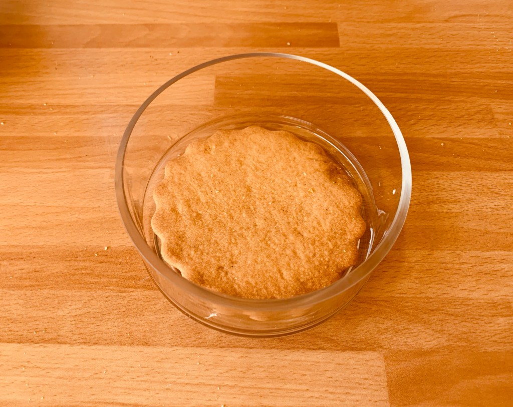 Montaggio del dolce: posizionare sulla base del bicchiere e della ciotolina un dischetto di frolla, poi coprire con la Crema per metà del bicchiere o ciotolina, sbriciolare della frolla e completare con la Crema