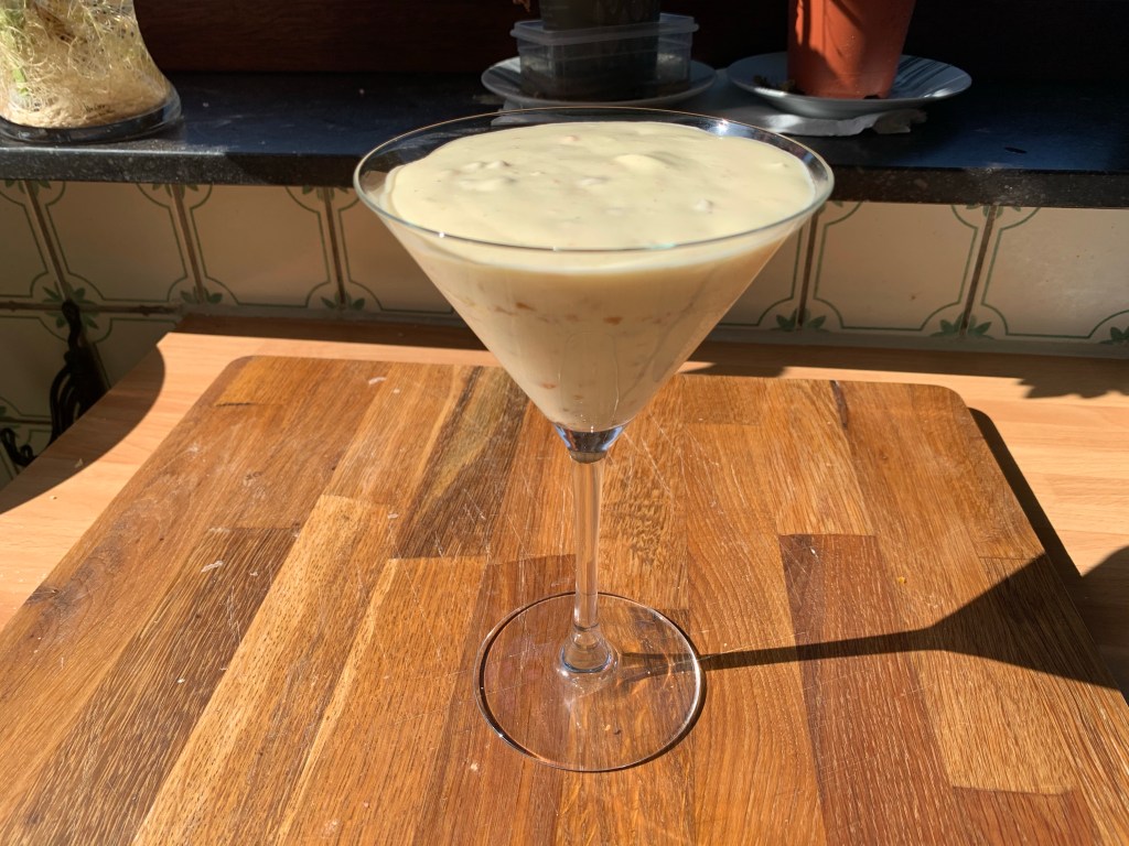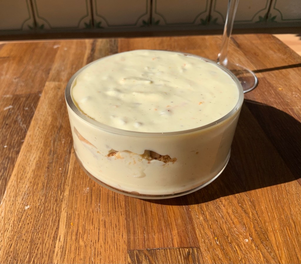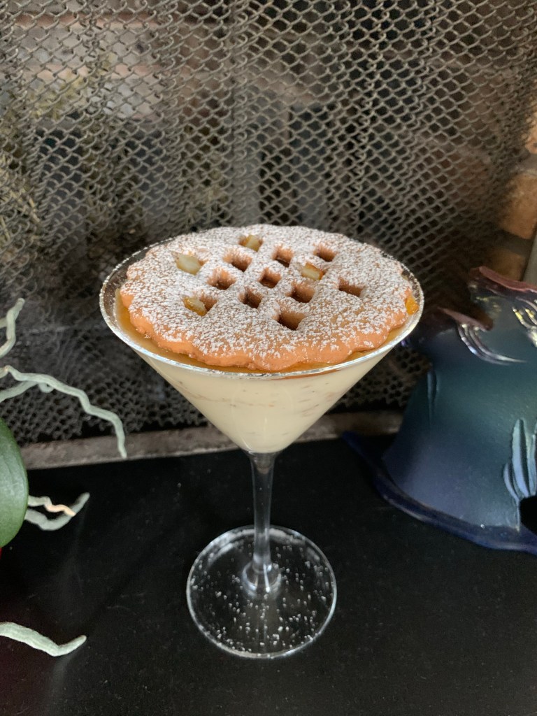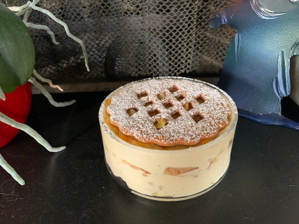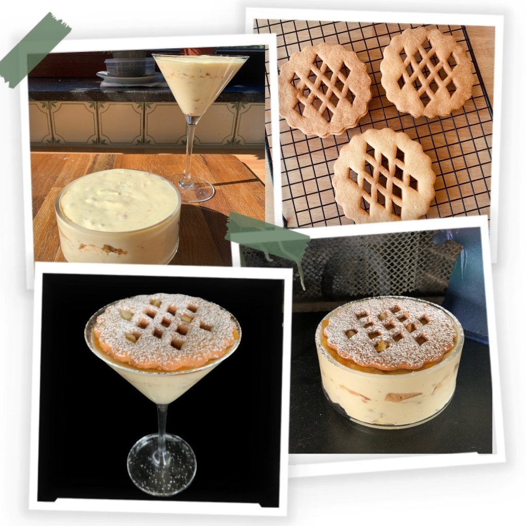 La mia versione è una mono porzione in tazza martini e una ciotolina trasparente decorata con una griglia di frolla cotta a parte.