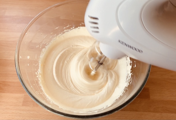 Aggiungere la panna semi montata con i rimanenti 40 grammi di zucchero, qualche goccia d’acqua ai fiori d’arancia, infine la montata di tuorli ed amalgamare il tutto con la spatola di gomma, poi trasferire il composto in una sac a poche