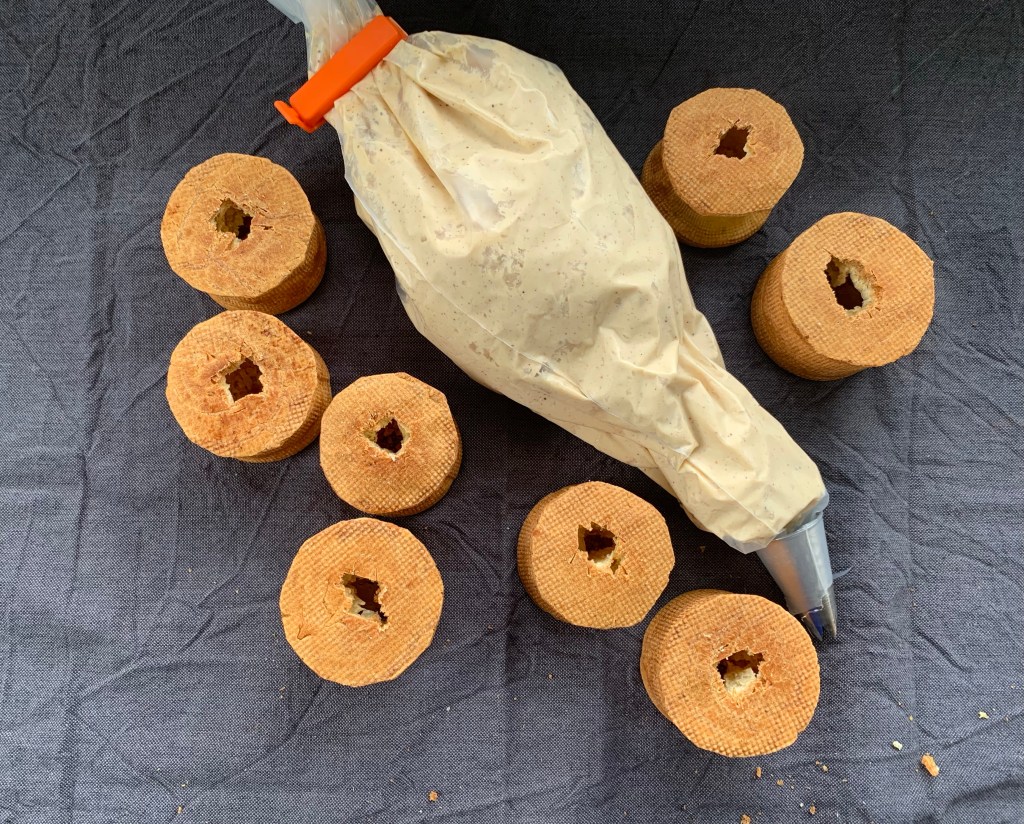 Montare la ganache con le fruste elettriche e traferirla in un sac a poche, forare gli Choux Cilindro con un coltellino e farcirli con la ganache