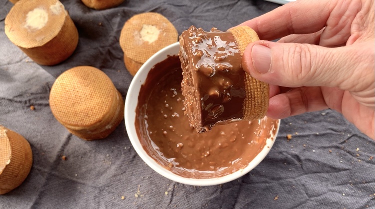 Intingere gli Choux nella glassa Rocher dalla parte della farcitura