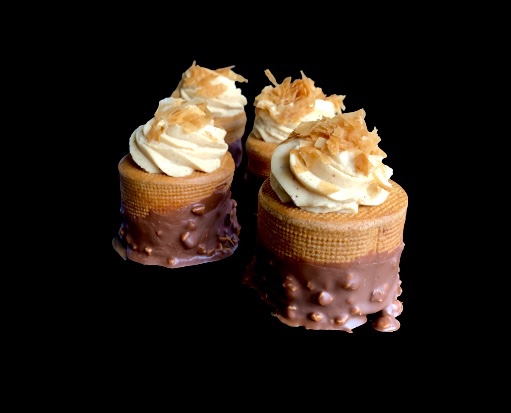 Dopo aver preparato lo Choux Geometrico a Cilindro ocorreva farcirlo e decorarlo per la degustazione finale. Per la farcitura ho utilizzato una Ganache montata al cioccolato bianco con il mio pralinato alle Mandorle e Nocciole, ricetta che vi metterò nella descrizione. Ho imbevuto la base in una glassa Rocher di cioccolato al latte con granella di nocciole e completato il dolcetto con un un ciuffo di Ganache e petali di pasta fillo cotta in forno e sbriciolata. Se gli choux li preparate prima e poi li congelate la preparazione della Ganache é abbastanza rapida così come l’assemblaggio.