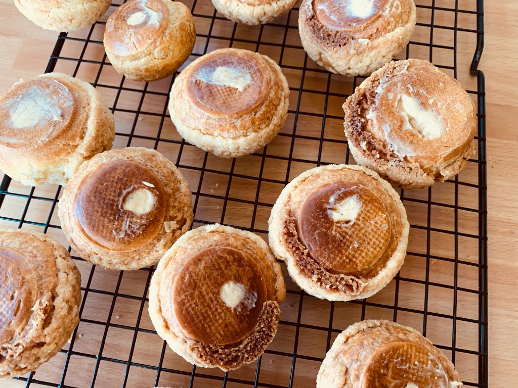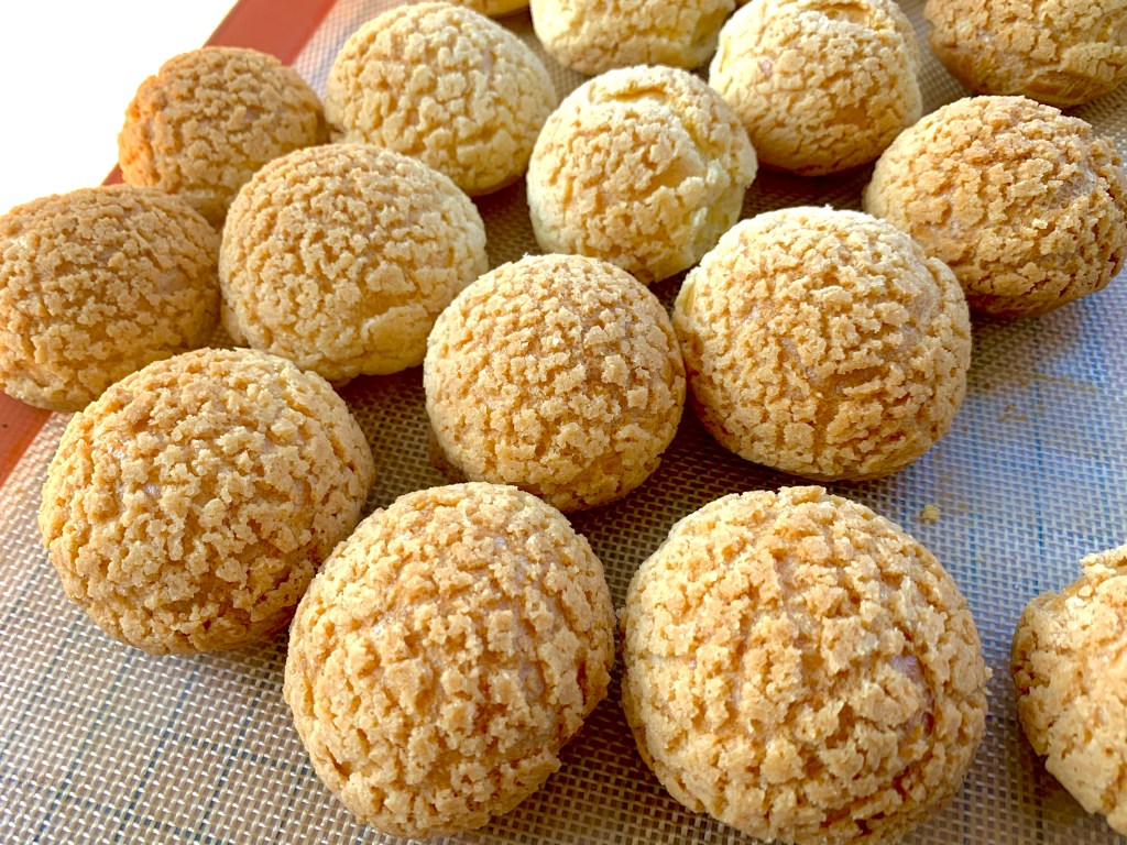 Coppare dei dischetti di craquelin da 5 cm e adagiarli sopra gli choux e cuocere in forno statico preriscaldato a 170 gradi per 30 minuti, senza aprire il forno fino a fine cottura