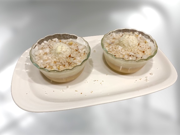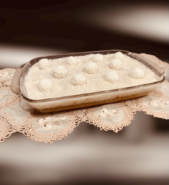 Prima di servire la Torta di Cocco in Pirofila, incastrare i Raffaello sulle porzioni preparate e del cocco essiccato, servirlo freddo o a temperatura ambiente