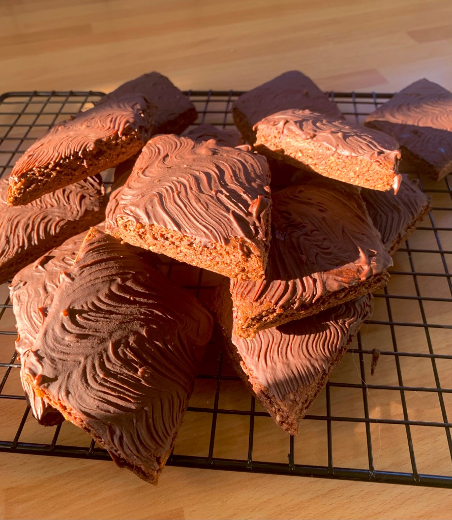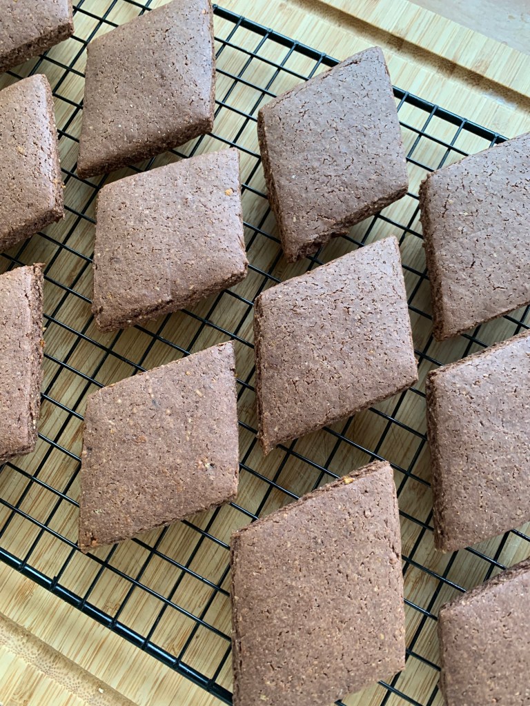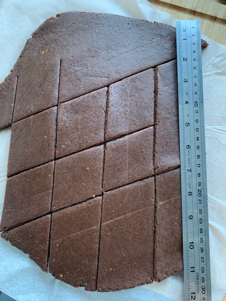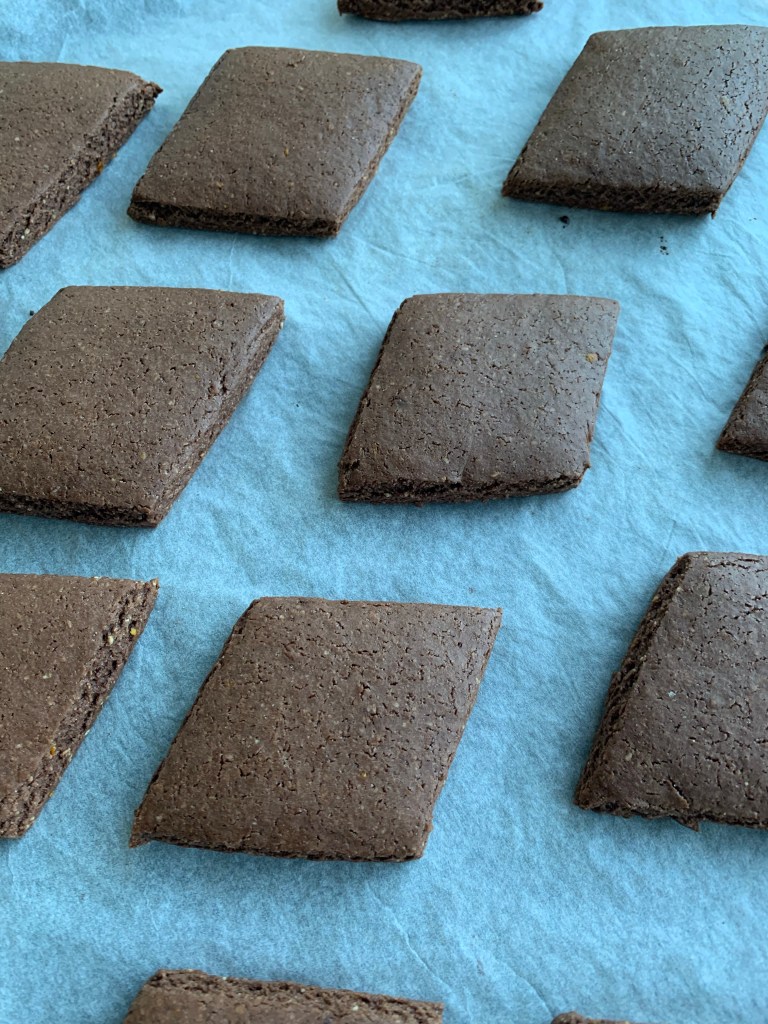 Stendere l’impasto ad 1cm di spessore e tagliare dei rombi da 6 cm di lato, poi adagiarli su una leccarda coperta da carta forno e cuocerli n forno statico preriscaldato a 180° per circa 20 minuti poi farli raffreddare su una gratella