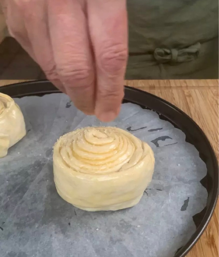Arrotolare su se stessa la prima striscia e poi arrotolarla sulla seconda striscia più corta, adagiare i due rotoli su una placca coperta con carta forno e spennellare la superficie totale con l’uovo sbattuto e spargere sulla parte superiore lo zucchero