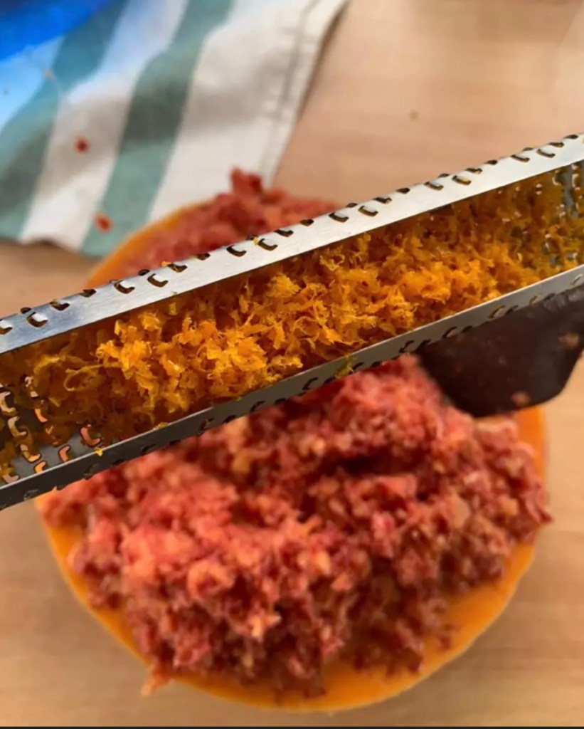 In una ciotola montare le uova con gli zuccheri aggiungere la polvere di mandorle in tre volte e mescolare delicatamente, aggiungere il sale e sempre in 3 volte il composto di carote con la scorza grattugiata di arancia