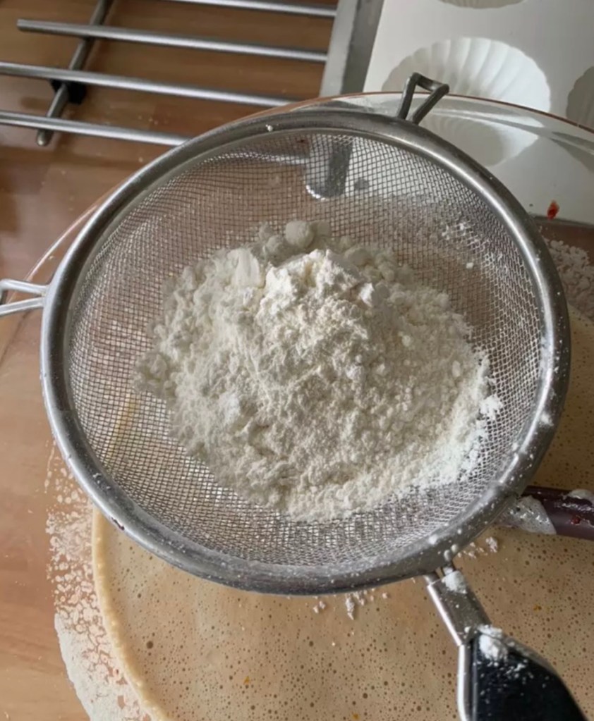 Unire la farina setacciata con il lievito ed integrarla al composto
