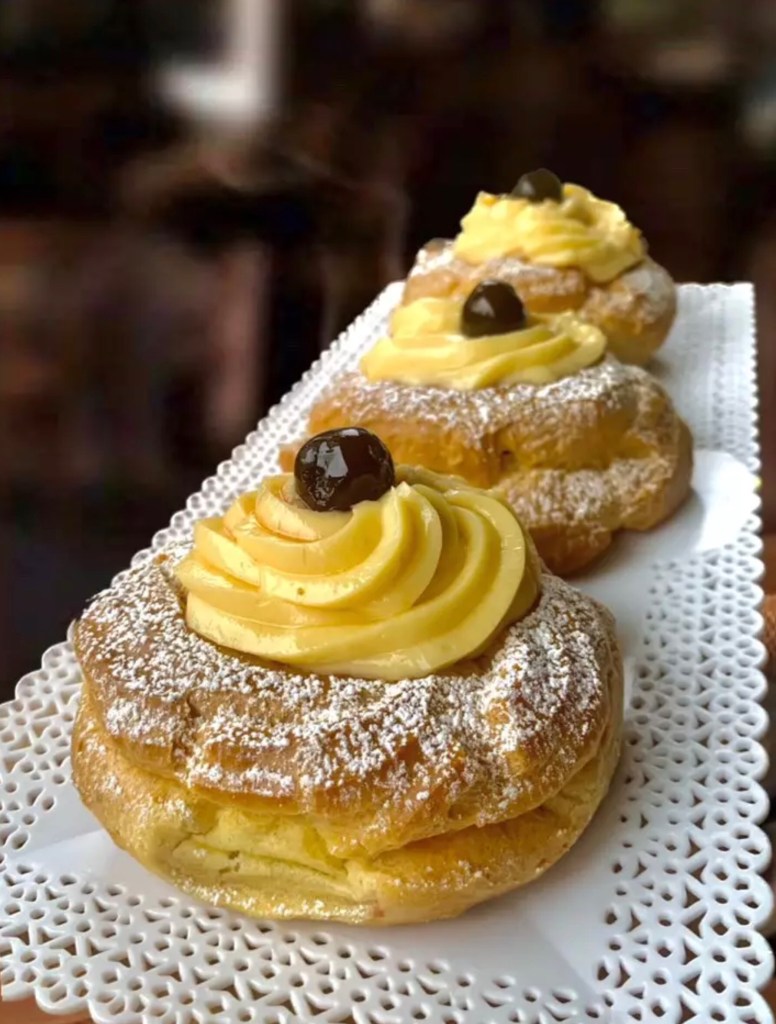 Infine decorate ogni zeppola con un ciuffo di crema Pasticcera, un’amarena sciroppata e una leggera spolverata di zucchero a velo