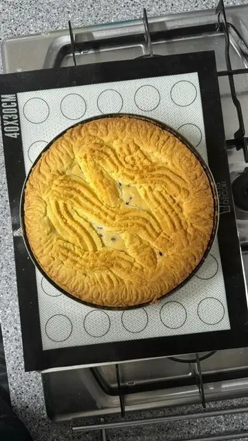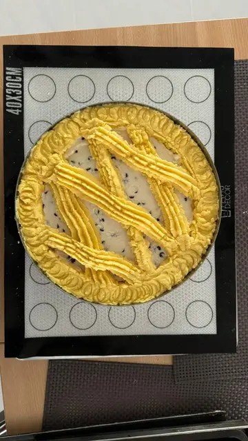 Utilizzando nuovamente il sac a poche con la pasta frolla morbida formare 3 strisce incrociate e poi il bordo finale, per coprire le imperfezioni delle strisce con il bordo, e far cuocere in forno a 160° C per circa 30/40 minuti o fino a doratura.