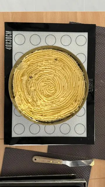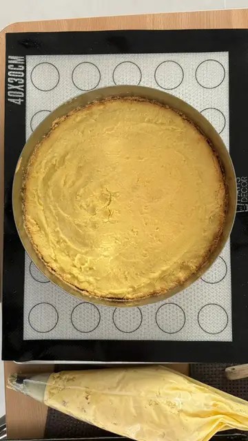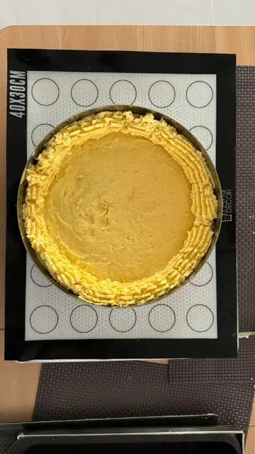 Utilizzando un sac a poche, munito di bocchetta rigata, foderare con la pasta frolla morbida ottenuta il fondo di un anello da 20 cm, imburrato e posizionato su un tappetino in silicone o carta forno, allo spessore di un centimetro, partendo dal centro formando una spirale e cuocerla per 10 minuti a 190 gradi