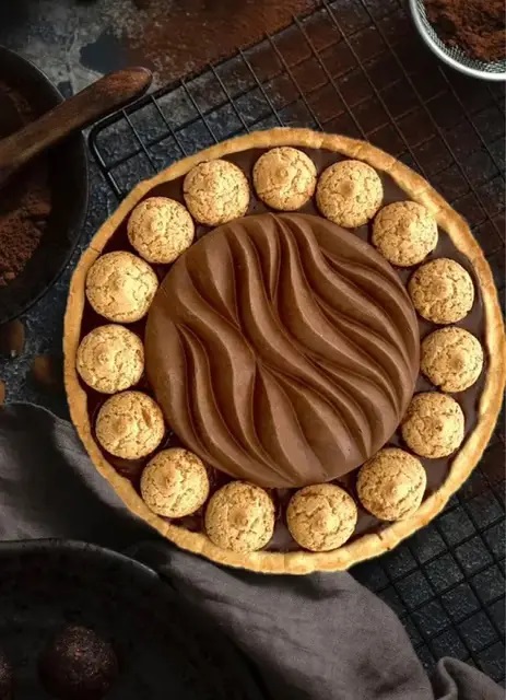 Decorare con degli amaretti e con il resto della namelaka inserita in uno stampo decorativo di silicone e congelato