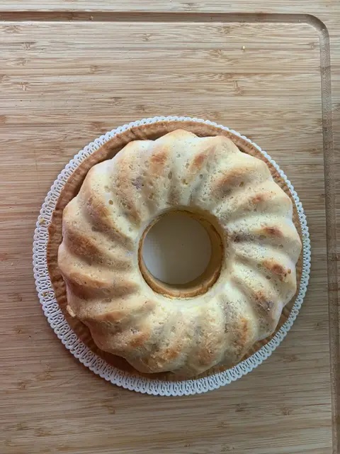 Riempire per metà lo stampo in silicone a ciambella preferito, io questo nella foto, poi cuocerlo in forno statico preriscaldato a 180° per 30 minuti, prova dello stecchino per verificarne la cottura, raffreddarlo a temperatura ambiente e poi in congelatore per almeno 6 ore