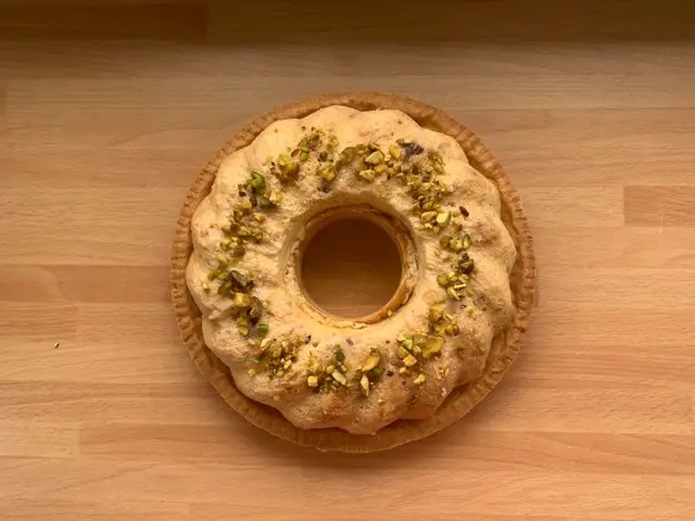 Una versione in crostata a ciambella della classica Pastiera Napoletana, un guscio di pasta frolla pre cotto e spennellato con cioccolato bianco e burro di cacao. Un ripieno classico della pastiera, cotto a parte in una forma di silicone. Dopo averlo congelato l’ho adagiato sul guscio e spennellato con marmellata di arance.