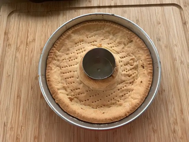 Riprendere la pasta frolla e foderare il classico stampo della Pastiera, posizionare un coppapasta al centro del diametro leggermente inferiore del foto del ripieno e foderarlo con la frolla, forare il fondo con una forchetta e cuocerla in bianco per 30 minuti a 170°