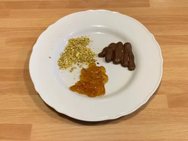 Adagiare alla base del piatto, adatto per il forno, un cucchiaio di marmellata di arance amare, la ganache al caffè, la granella di pistacchi e tre parti del piatto lasciarle vuote, vedi foto.