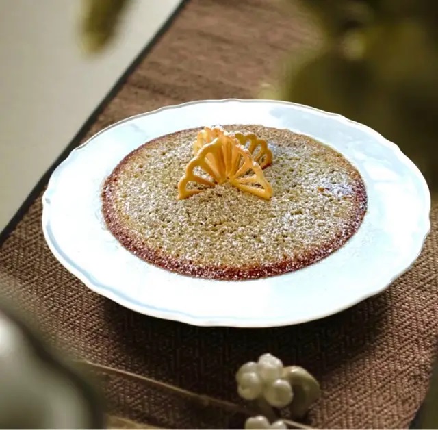 Un dolce al piatto preparato dallo Chef Paolo Griffa e servito al Grand Hotel Royal di Courmayeur. Un gioco di fine pasto che porta il commensale a scoprire cosa si nasconde sotto lo strato di frangipane. Preparato e cotto direttamente nel piatto di portata, viene servito tiepido.