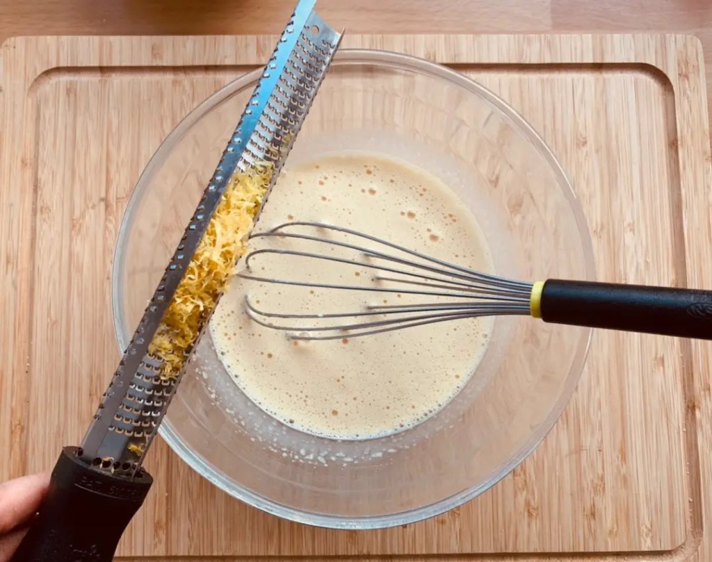 Per la pastella : In una ciotola sbattere con una frusta le uova intere con i tuorli, lo zucchero e il liquore, poi aggiungere la panna fresca e la scorza del limone e mescolare