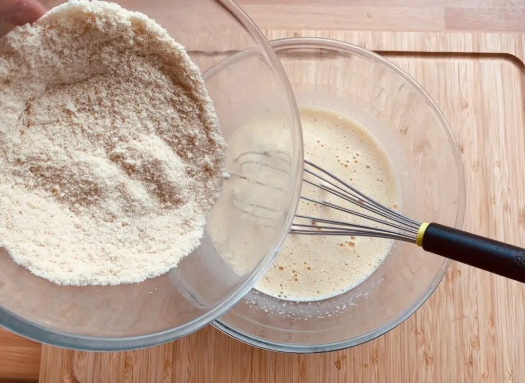 Mescolare insieme la polvere di mandorle, l’amido di mais, il sale e il lievito, poi aggiungerli alla pastella.